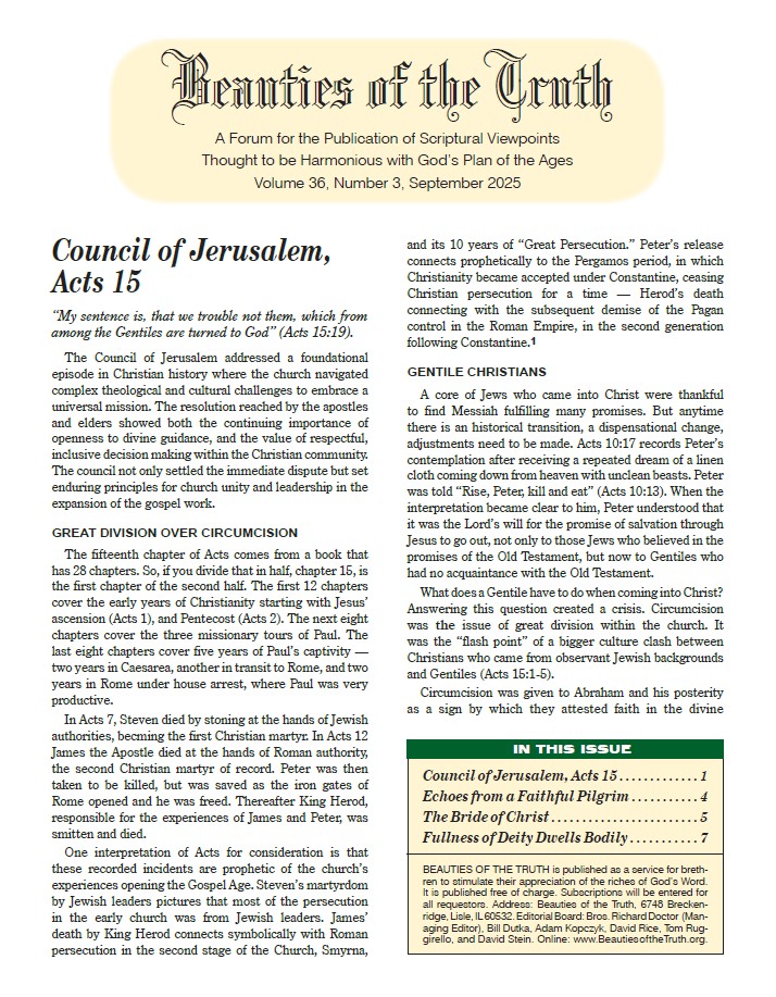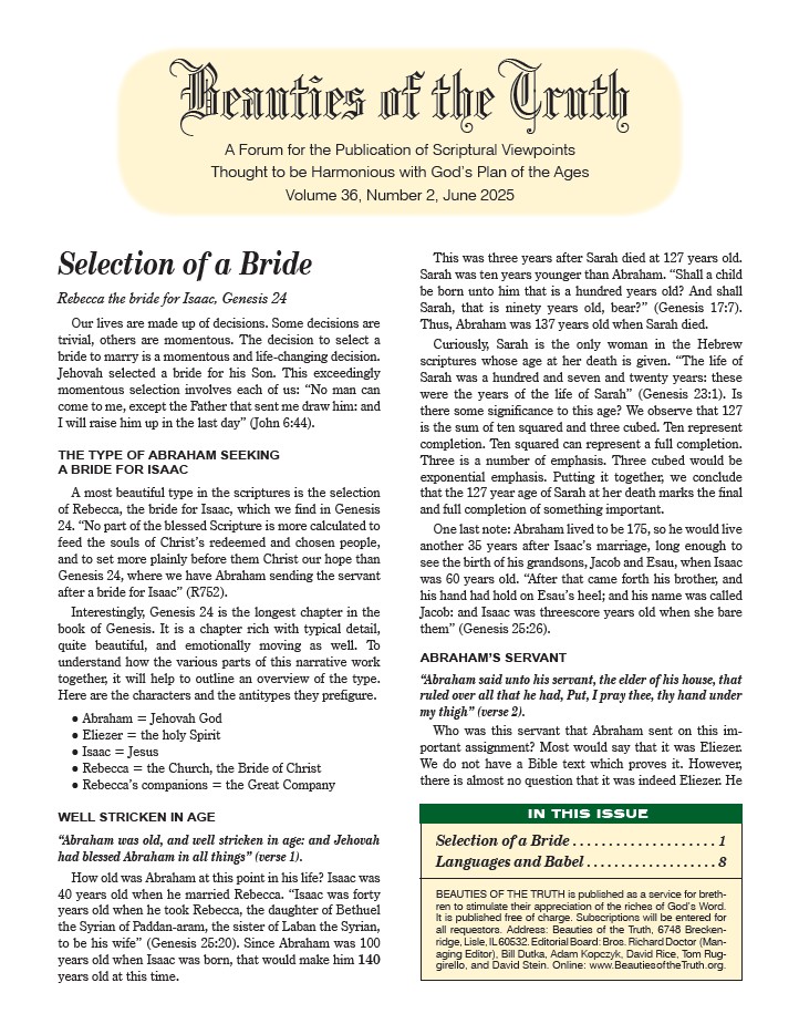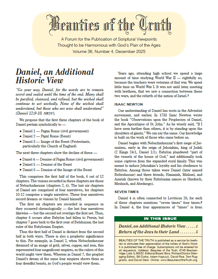 Beauties of the Truth is a Quarterly publication highlighting Present Truth scriptural topics possibly new to some of the readership, church history, issues relating to Bible translation, and science when it testifies in harmony with scripture. (2 Peter 1:12) The Bible is the revealed word of God focusing on Jesus Christ as “the Ransom for all, to be testified in due time.” (1 Timothy 2:6)
