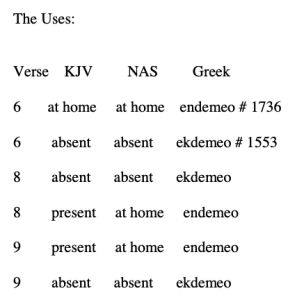 The meaning of this passage is greatly obscured by the presence of poor translation. In the King James Version, two Greek words are translated three ways in English: ‘at home,’ ‘absent,’ and ‘present.’ The NAS uses only two English equivalents: ‘absent’ and ‘at home.’ The only word which closely gives the actual meaning of the Greek is ‘at home’ – meaning comfortable with one’s surroundings.