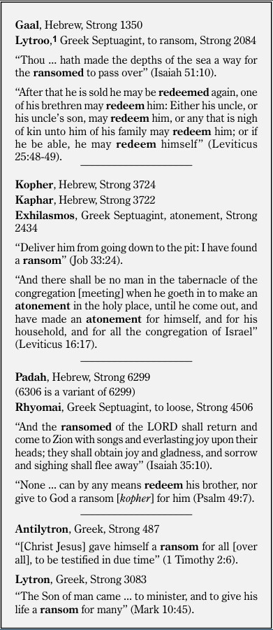 Following are selected texts from the Old Testament, using gaal, kopher, kaphar, or padah (or its variant), properly translated.