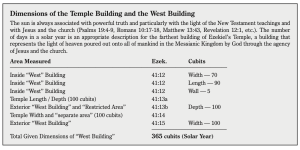 At this point the dimensions of the West Building can be collated into a summary and while at the same time segregated from the dimensions for the Temple Building. See the inset below, “Dimensions of the Temple Building and the West Building.” When the dimensions of the West Building are added in the same manner as they are listed in Ezekiel, they sum to 365 cu- bits, or the same number of cubits as days in a solar year.