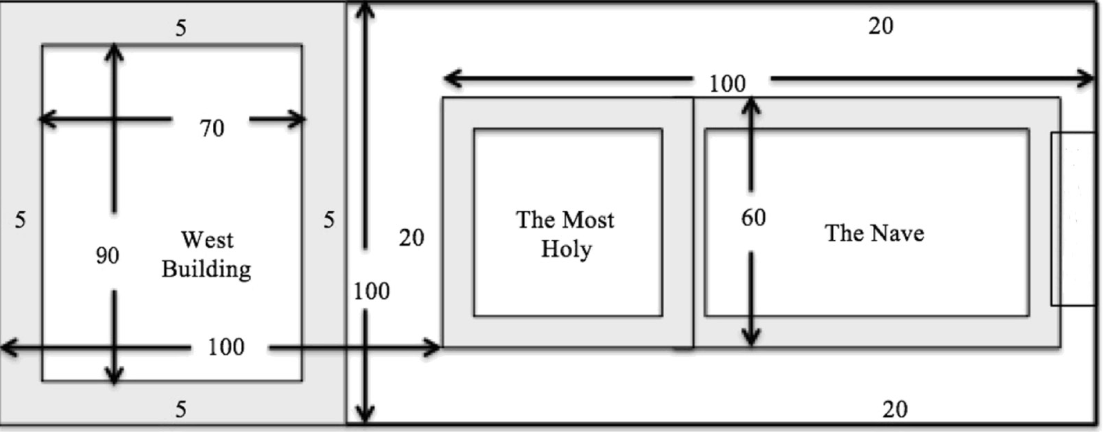 The dimensions of both the Temple Building and the West Building are given in Ezekiel 41:12-15. “The building fronting a restricted area on the west was 70 cubits wide; there was a wall round it 5 cubits thick, while its length was 90 cubits. Next he measured the temple, which was 100 cubits long, and the restricted area plus the building, including its walls, which in all were 100 cubits deep. The breadth of the front of the temple plus the restricted area to the east was 100 cubits. He then measured the length of the building that lay alongside, i.e., behind, the [other] restricted area, and it was 100 cubits.”2