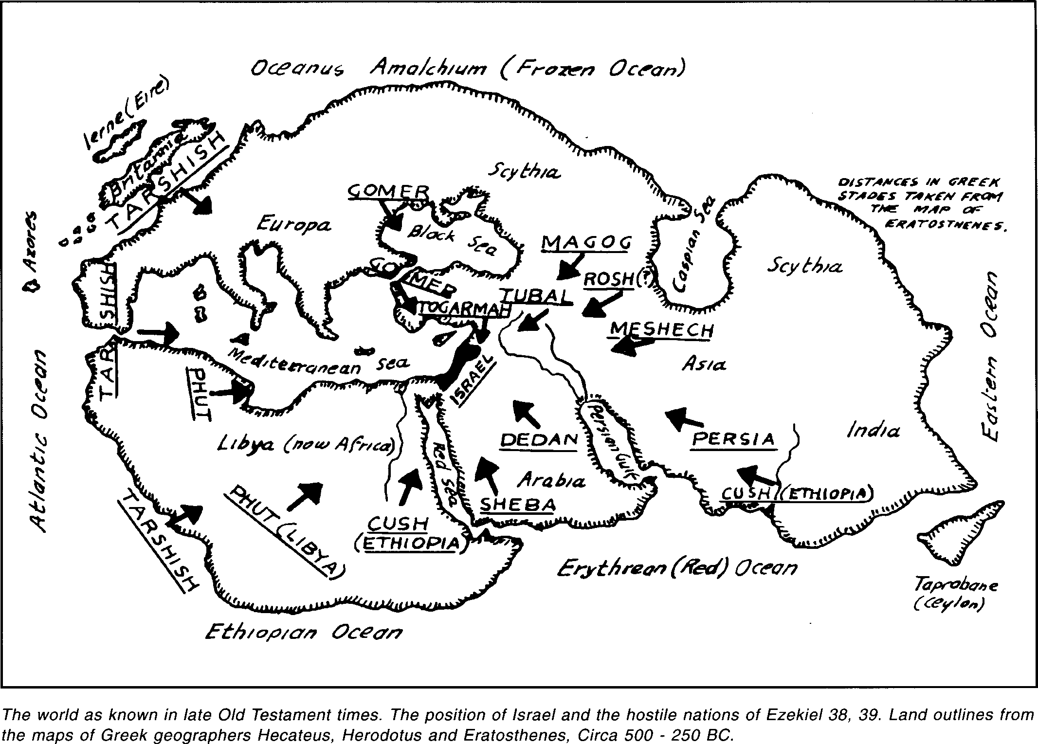 It is necessary first of all to identify the actors in the drama. A noteworthy feature of this prophecy is that Israel’s traditional, and usual, enemies do not figure in the account and are not so much as mentioned. Syria, Assyria, Babylon, Moab, Ammon, Edom, Egypt, Philistines, Amalekites, Midianites, Amorites, appear time after time on the pages of the Old Testament in combat with Israel. Not one of these appears in this narrative; their place is taken by nations hitherto unknown to Israel and coming from a great distance, from the far corners of the earth in fact. This of itself is a significant factor. It must indicate that the conflict foreseen by Ezekiel has to do with other and far greater issues than those which have traditionally concerned Israel in the past. The situation is not, as formerly, Israel versus her neighbor tribes and peoples, but Israel versus the wider outside world. The battle is not against the Israel that conquered Canaan under the leadership of Joshua but a greater and more dedicated nation which has gathered into a more extensive Holy Land under the headship of God. But before we can understand the details of this Battle of the Great Day in the light of Ezekiel’s vision we must first learn our history.