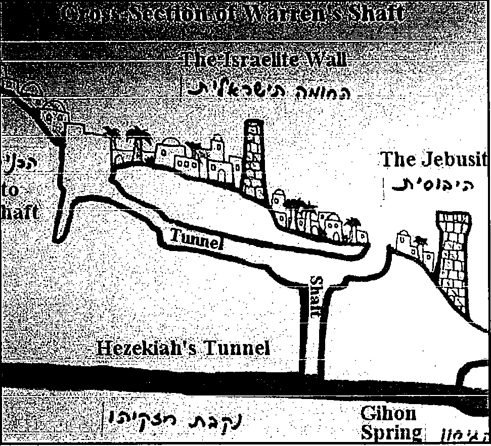 This gave the city access to the water not only by the new enlarged Pool of Siloam, but also by the more arduous gutter route from higher up the mount which is now called Warren’s Shaft after the archaeologist who unearthed it. The schematic below displays these two access routes.