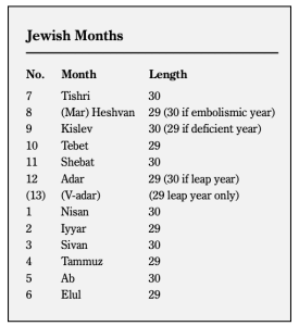 In the current Jewish calendar the months are tied in closely, but not precisely, with the new moons. Calculation is used, rather than observation. The calendar may be shifted by a day so that certain days will not conflict with sabbaths. The Jewish months and their lengths are given above.