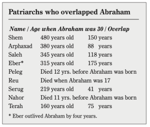 Most of us learn things by being taught by others. Abraham learned faith by seeing it in others and hearing about it from them, most notably his forbearers. Notice whom Abraham could have seen and talked to. Here is who was alive when Abraham was age 30 years: