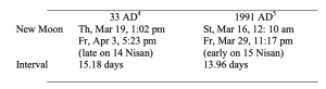 The full of the moon occurred shortly after our Lord’s death (at 5:23 p.m. on Friday, which was almost into the beginning of Nisan 15 at 6:00 p.m.). Hence, in 33 AD the full of the moon occurred almost a full day after the Memorial celebration. Therefore, if our modern observance of the Memorial falls a day before the calendar indicates the moon to be full, that would be entirely consistent with what occurred in our Lord’s day. However, because of a considerable variation in the moon’s orbit, we should not expect this pattern to repeat each year. It turns out that the moon’s waxing period varies from 13.9 days to 15.5 days, averaging 14.7 days to reach maximum fullness. The moon is regularly full on the 15th of Nisan but occasionally will be full on either the 14th or 16th day. Hence we should not normally expect to find the moon full on the night (beginning) of the 14th of Nisan at our Memorial time, but at least one night later. For example, in the year 1991 our Memorial was celebrated on Thursday evening, March 28, after 6:00 p.m., which was the beginning of Nisan 14. The moon did not become full until 11:17 p.m. on Friday, March 29, when the 15th of Nisan had already begun. Since it had only taken 13.96 days to become full that year, clearly even on a short orbit maximum fullness may occur on the 15th day (rather than the 14th); on average it will be on the 15th day and on a long orbit it may occur on the 16th of Nisan. The table below lists specific comparisons for the years 33 AD (Julian calendar, Jerusalem mean time) and 1991 AD (Gregorian calendar, Pacific standard time):