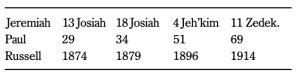 Since Jesus is represented by the first and seventh messengers following the two advents, it is noteworthy that four dates prominent during Jeremiah’s ministry are paralleled by prominent dates following each of the two advents of Christ — first carried through Paul, later through Bro. Russell. Here, in chart form, is the comparison.